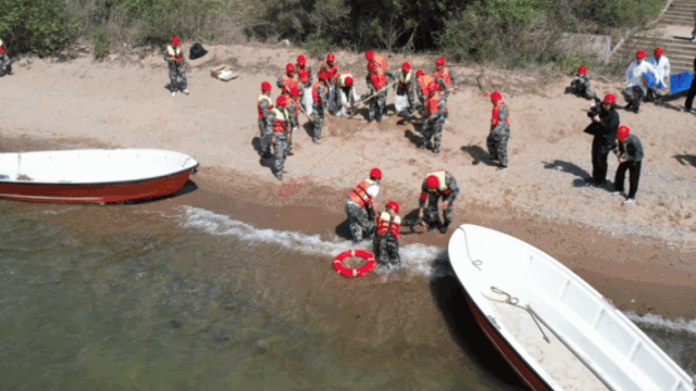 汛期即将到来,为了安全度汛,现场模拟施工现场突降暴雨,水库水位迅速上涨,防汛应急小组立即行动,手摇警铃报警,水上作业人员、吊装作业人员立即停止一切作业,乘坐快艇返回到岸边。项目经理和技术负责人到达现场实地考察灾情及预测预警信息后,立即启动二级应急响应,对坝坡进行加高培厚,全力保障人员及工程安全。
