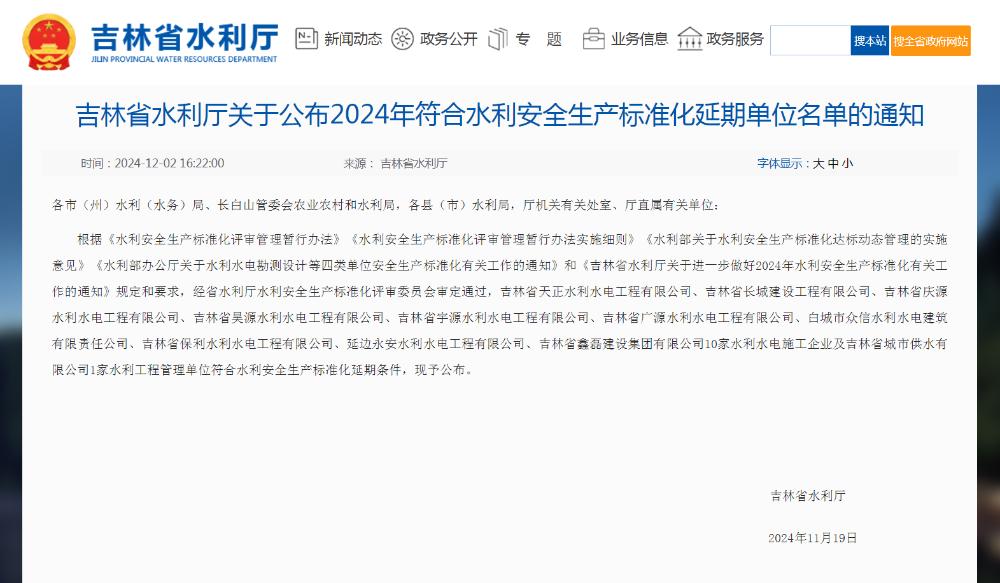 12月2日,吉林省水利厅公布了《2024年符合水利安全生产标准化延期单位名单》的通知。水工局公司下属庆源公司、昊源公司、宇源公司、广源公司4家子公司经省水利厅水利安全生产标准化评审委员会审定,顺利通过水利安全生产标准化二级达标单位延期复审。