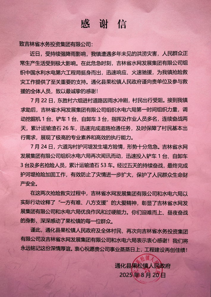 近日,集团公司收到一封来自通化县果松镇人民政府的感谢信,信中对吉林省水网发展集团在抗洪抢险工作中提供的迅速响应和全力支援表示衷心感谢。