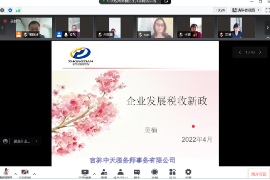 本次培训邀请了吉林中天税务师事务有限公司的高级经理进行授课,内容覆盖面全、实操性强,涵盖“六税两费”减免政策、服务业领域困难行业纾困发展有关增值税政策、中小微企业设备器具税前扣除政策、小微企业所得税优惠政策、增值税期末留抵退税新政、增值税小规模纳税人免征增值税政策、提高科技型中小企业研发费用税前加计扣除比例政策、3岁以下婴幼儿照护个人所得税专项附加扣除政策等方面内容,税务专家还就参会人员的提问进行了现场答疑。