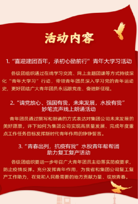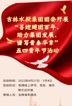 为认真贯彻落实团省委和省国资委团工委决策部署,持续巩固拓展党史学习教育成果,传承弘扬“五四”精神,引导广大青年团员厚植爱党、爱国情怀,立足岗位做贡献,同时结合我省疫情防控取得阶段性重大胜利的关键时期,充分发挥吉林水投集团共青团生力军作用,为我省复工复产贡献青春力量,以冲锋在前、担当在先的实际行动迎接党的二十大胜利召开。吉林水投集团团委组织开展“喜迎建团百年、助力集团发展、谱写青春华章”五四青年节活动。