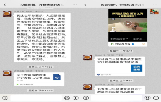 (二)传达文件精神,部署重点工作。公司党支部密切关注各官方发布疫情防控信息和集团公司疫情防控工作群内信息,及时向党员群众转发消息,关注最新疫情动态,正确把握舆论导向,不造谣、不信谣、不传谣,带头学习新型冠状病毒肺炎防控知识,充分利用微信工作群等媒介,全方位、多渠道开展科学防治知识宣传。