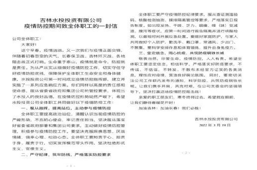 吉林终有吉临时,长春定复往常春。吉林水投投资有限公司将在省委、省政府、省国资委和集团公司的坚强领导下,进一步压实责任,有序推动防控力量下沉,全力做好疫情防控各项工作,勇担国企责任使命,坚决打赢疫情防控阻击战歼灭战。