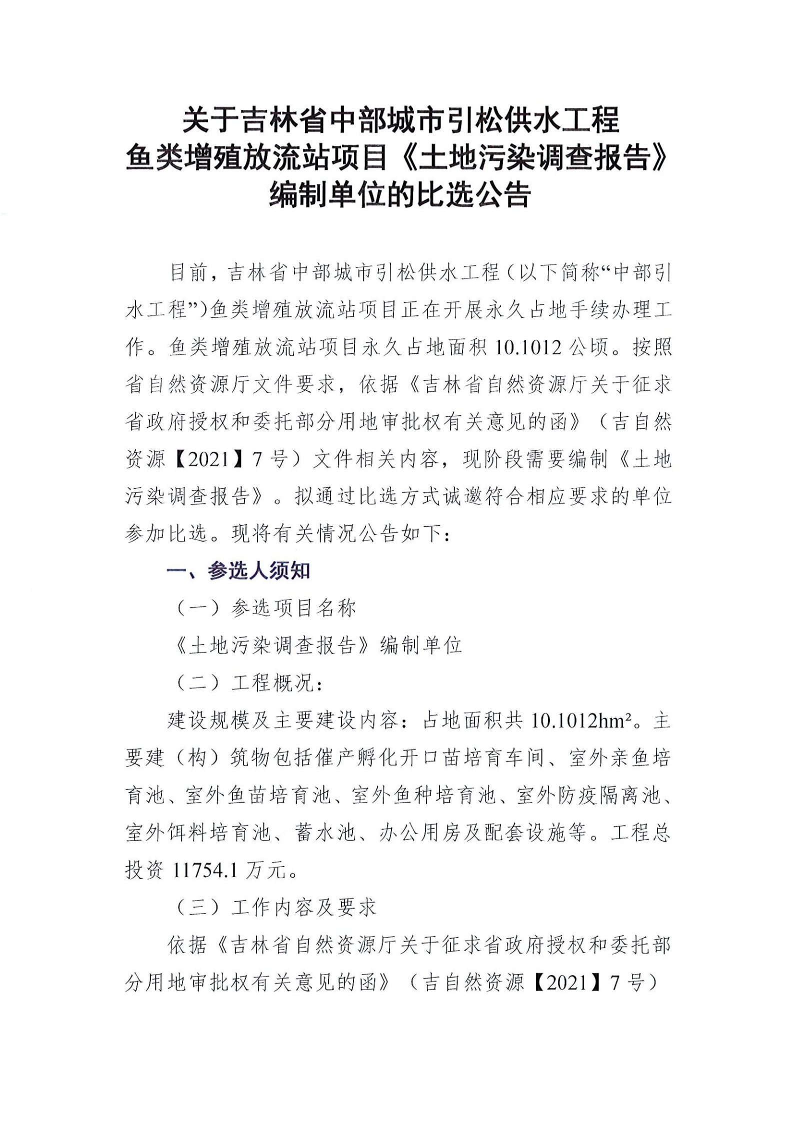 关于吉林省中部城市引松供水工程鱼类增殖放流站项目《土地污染调查报告》编制单位的比选公告