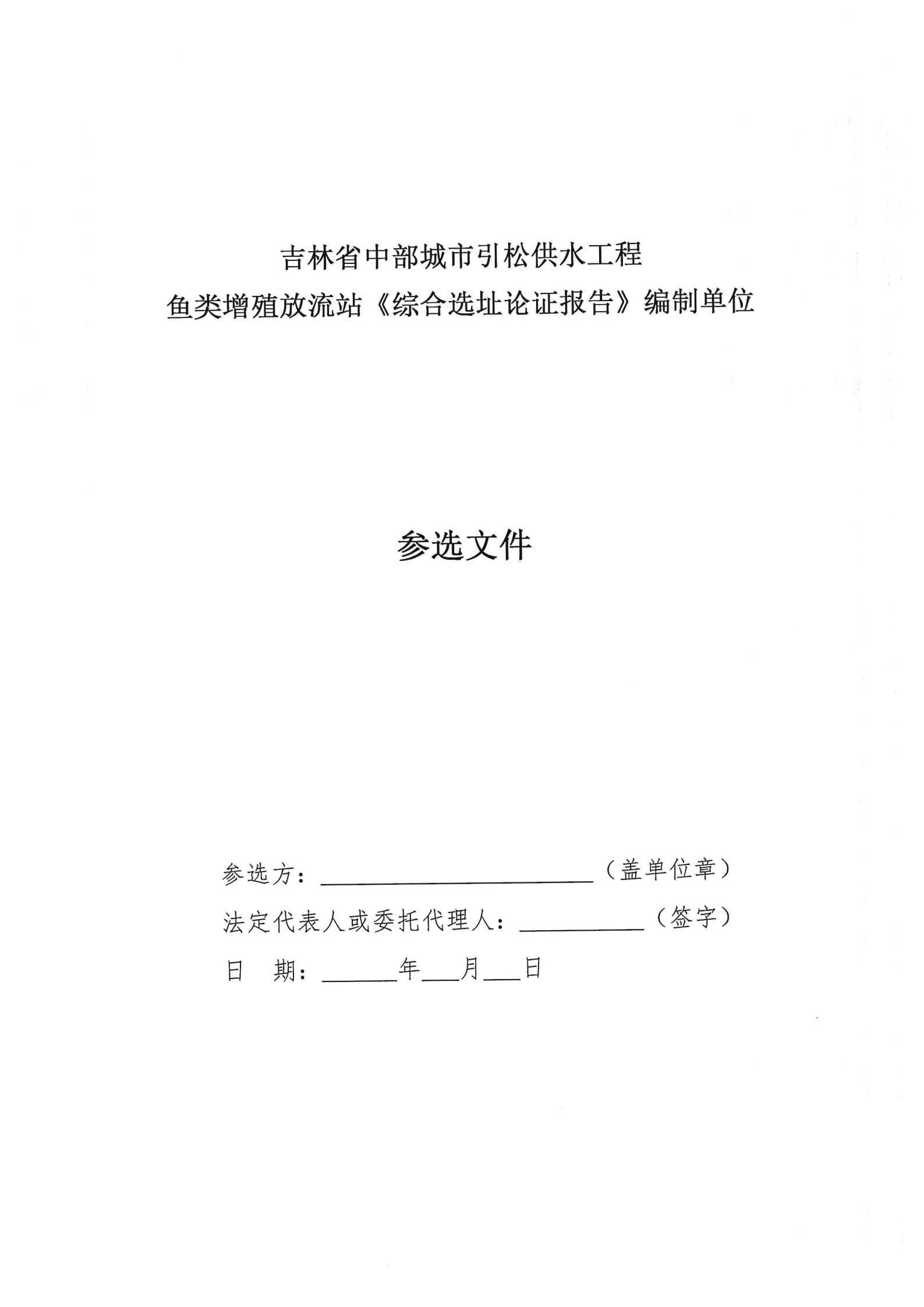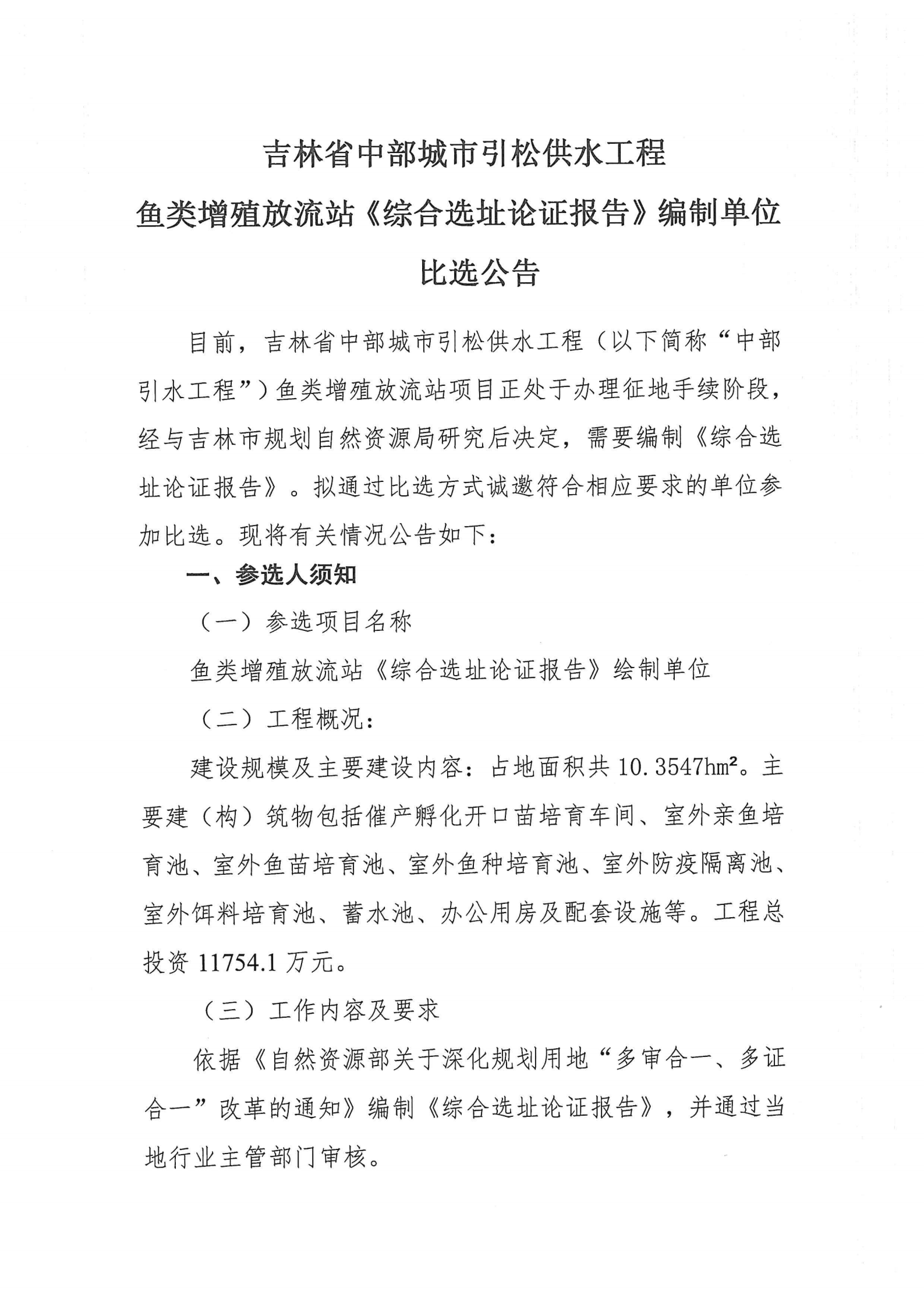 吉林省中部城市引松供水工程鱼类增殖放流站《综合选址论证报告》编制单位比选公告