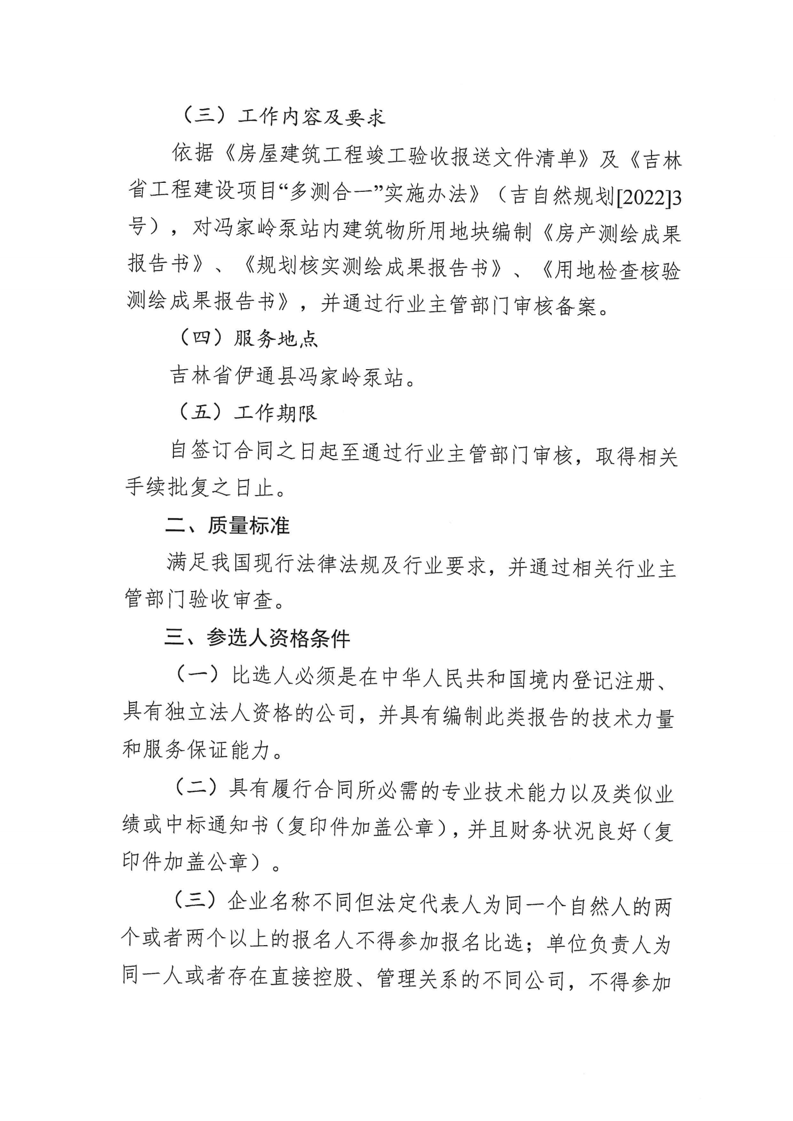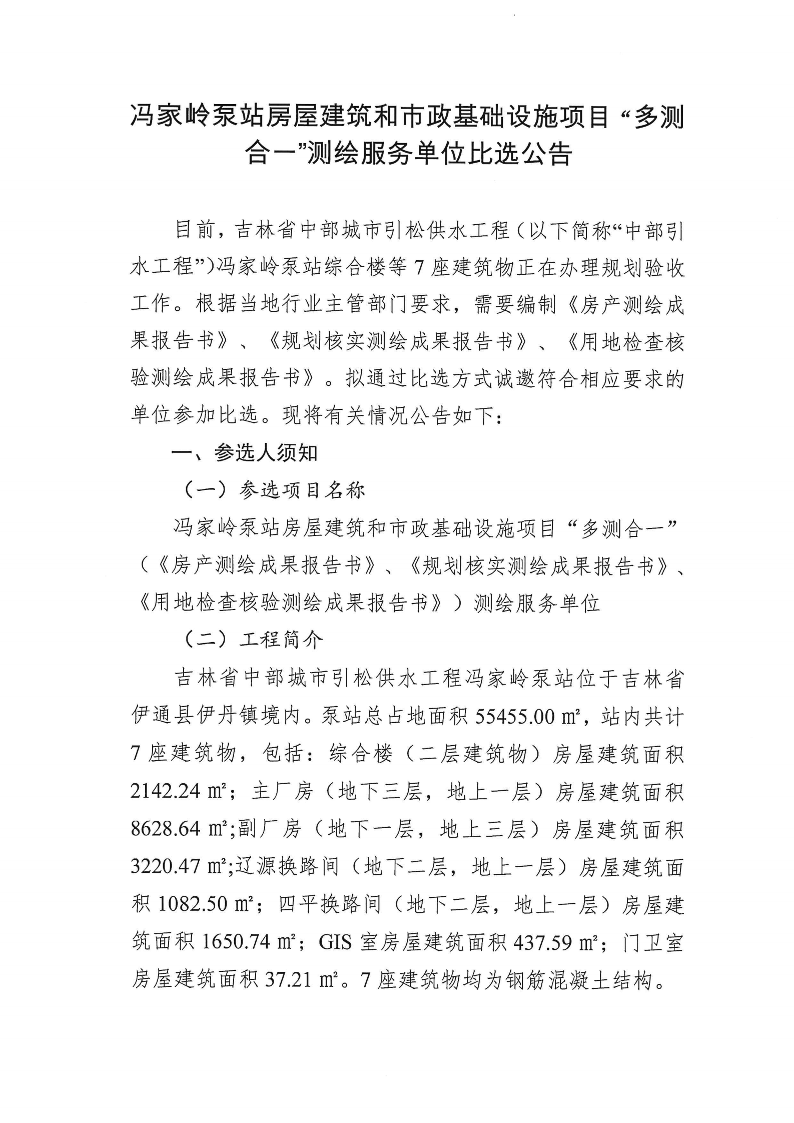吉林省中部城市引松供水工程冯家岭泵站房屋建筑和市政基础设施项目“多测合一”测绘服务单位比选公告
