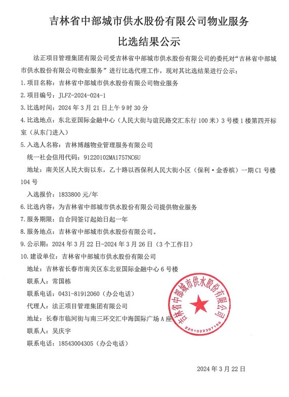 吉林省中部城市供水股份有限公司物业服务比选结果公示