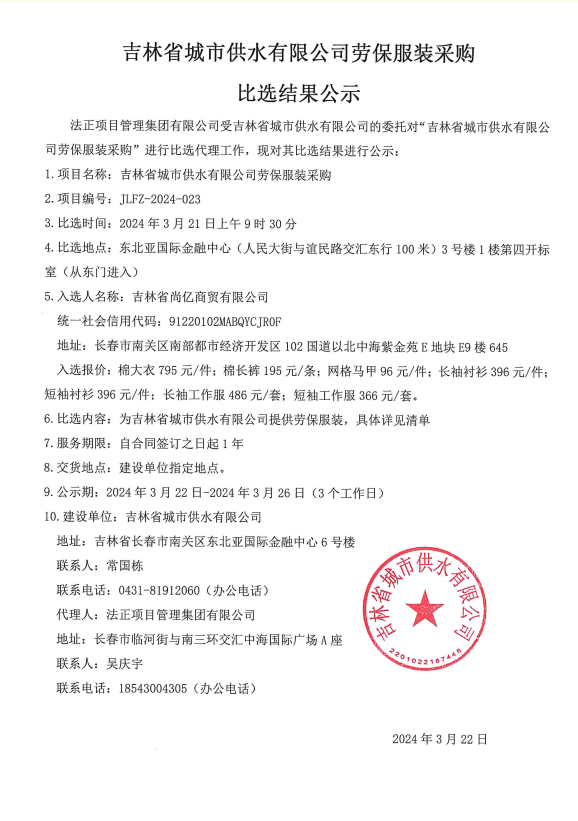 吉林省城市供水有限公司劳保服装采购比选结果公示