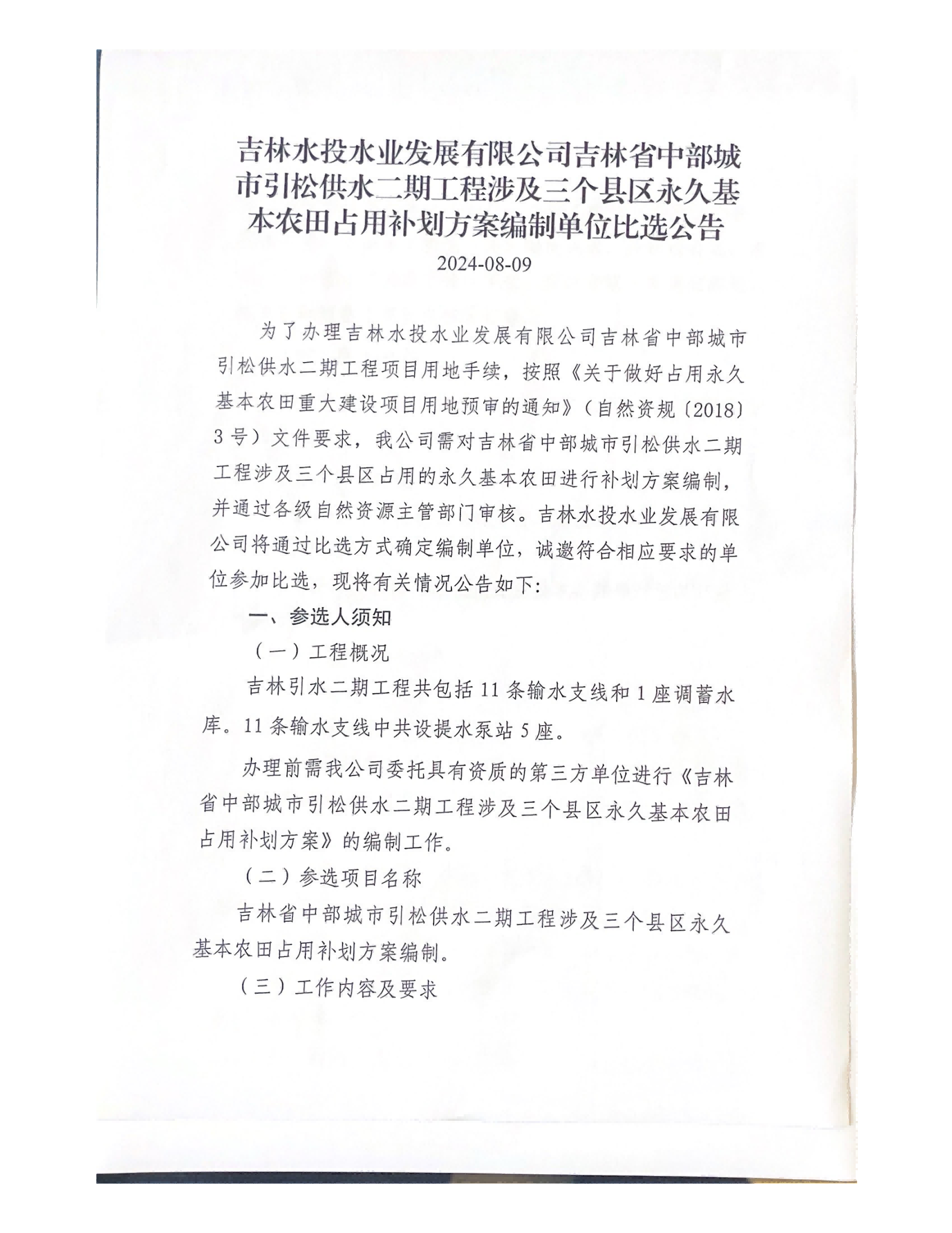 吉林水投水业发展有限公司吉林省中部城市引松供水二期工程涉及三个县区永久基本农田占用补划方案编制单位比选公告