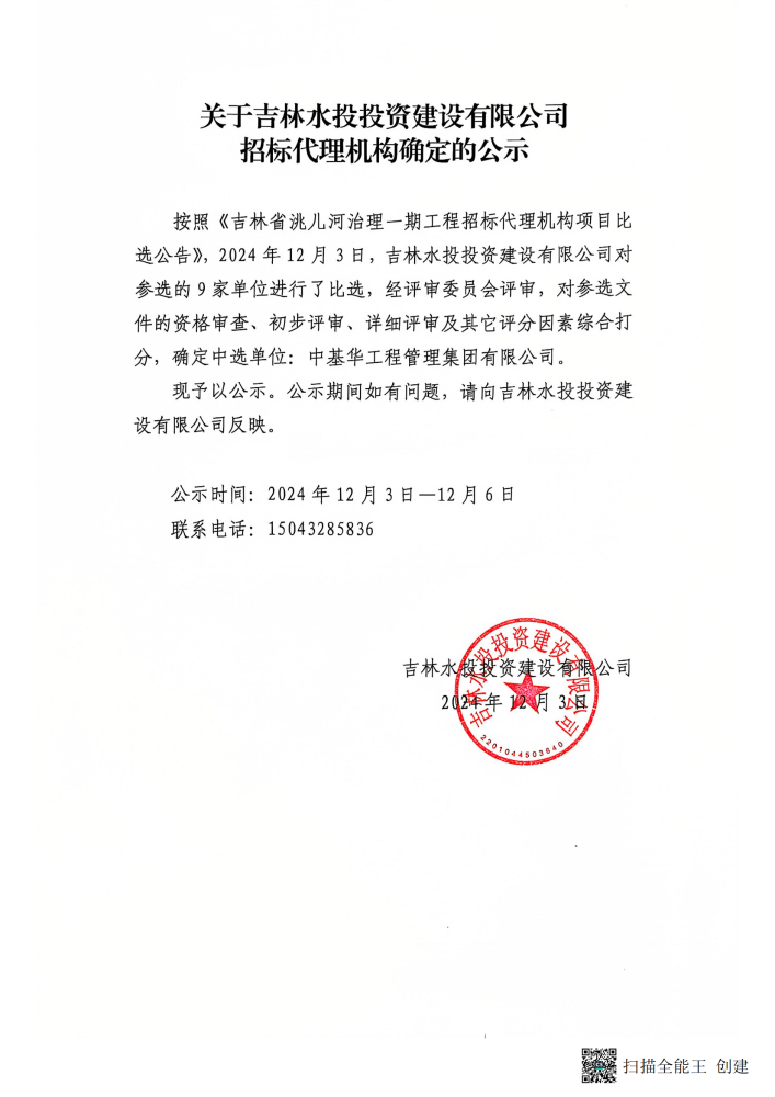 关于吉林水投投资建设有限公司招标代理机构确定的公示