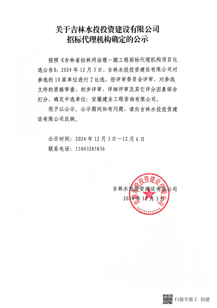 关于吉林水投投资建设有限公司招标代理机构确定的公示
