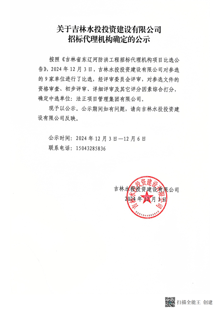 关于吉林水投投资建设有限公司招标代理机构确定的公示