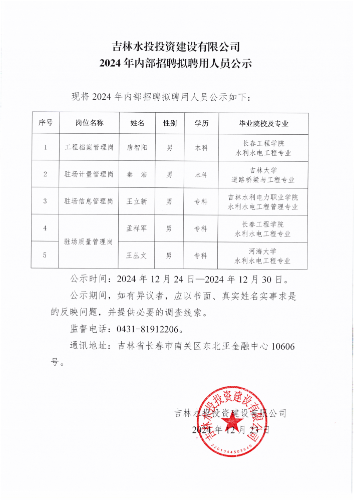 吉林水投投资建设有限公司2024年内部招聘拟聘用人员公示