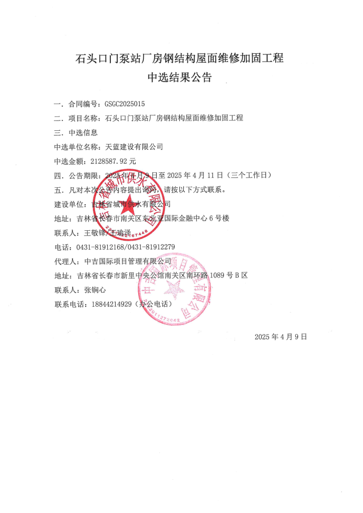石头口门泵站厂房钢结构屋面维修加固工程中选结果公告