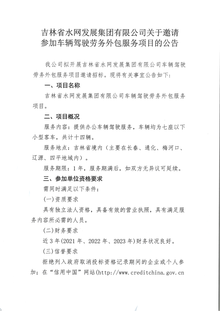 吉林省水网发展集团有限公司关于邀请参加车辆驾驶劳务外包服务项目的公告