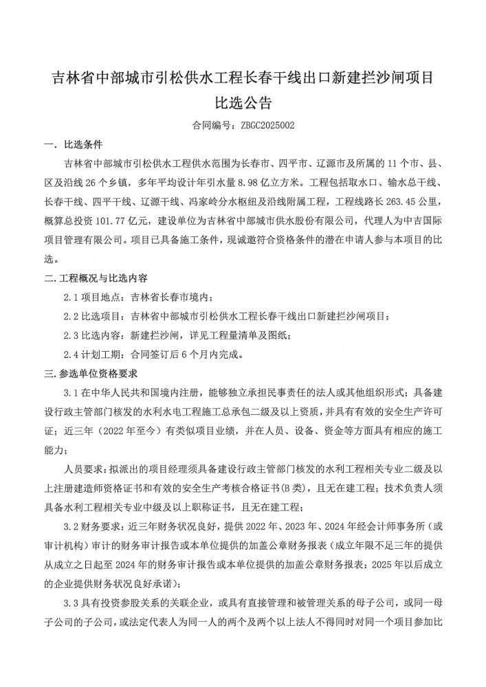 吉林省中部城市引松供水工程长春干线出口新建拦沙闸项目比选公告