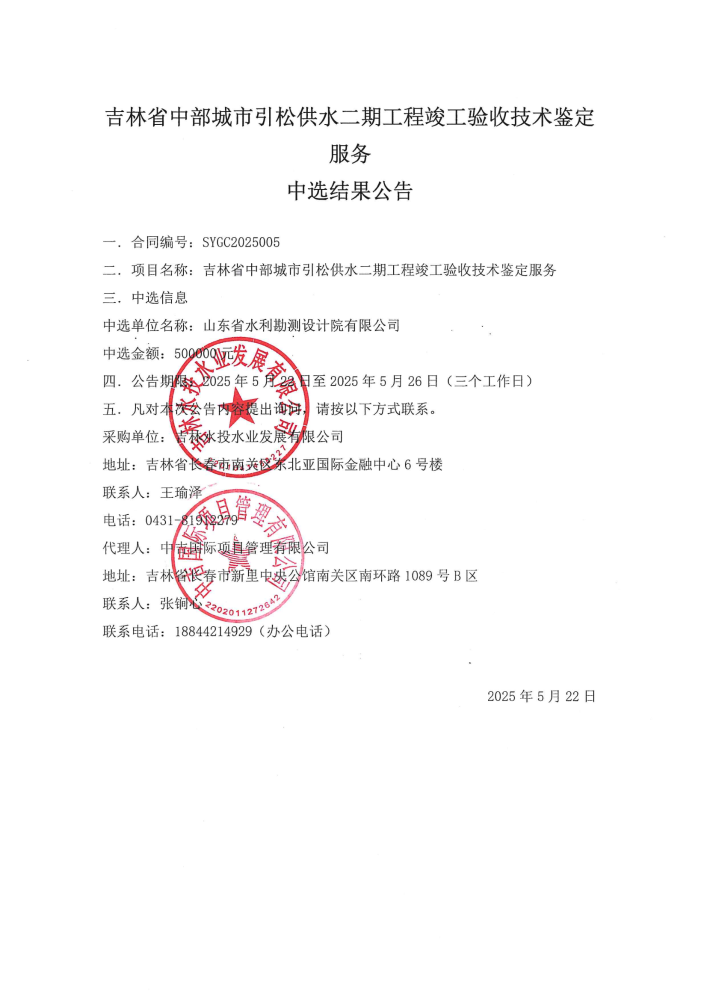 吉林省中部城市引松供水二期工程竣工验收技术鉴定服务中选结果公告
