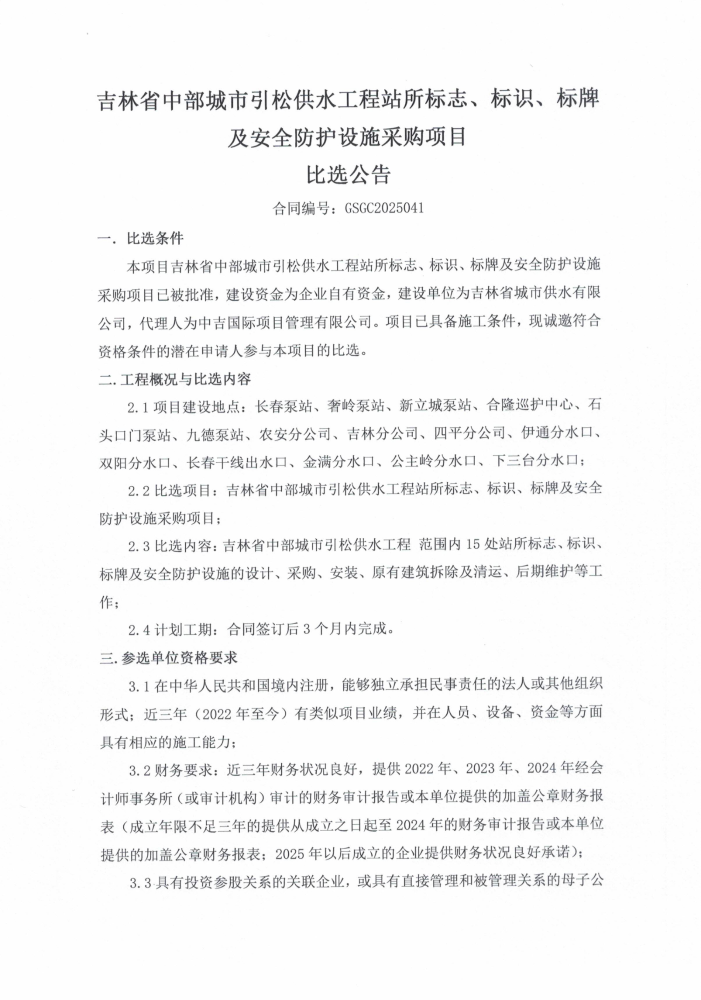 吉林省中部城市引松供水工程站所标志、标识、标牌及安全防护设施采购项目比选公告