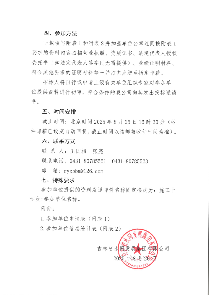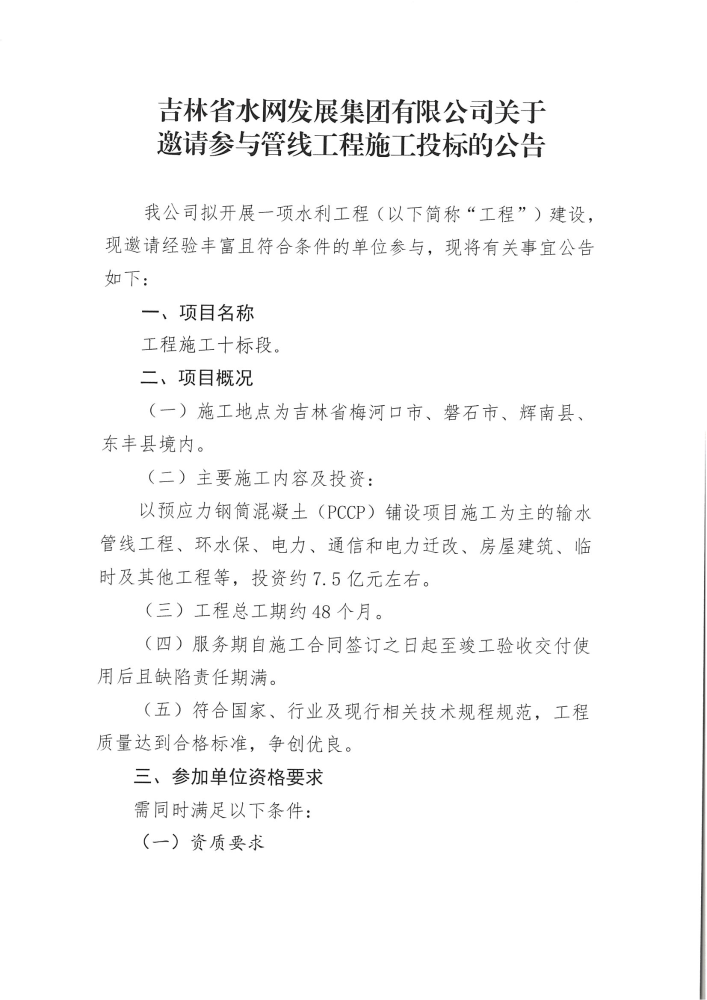 吉林省水网发展集团有限公司关于邀请参与管线工程施工的公告