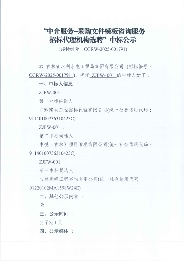 吉林省水利水电工程局集团有限公司中介服务-采购文件模板咨询服务招标代理机构选聘中标公示