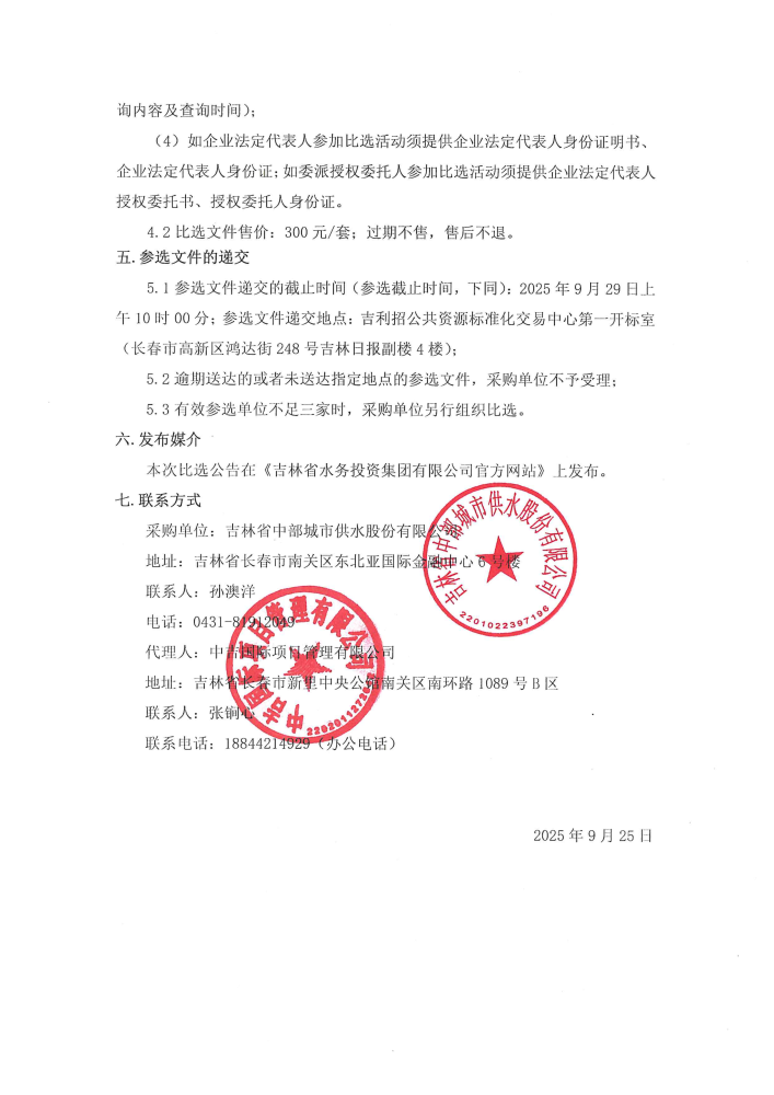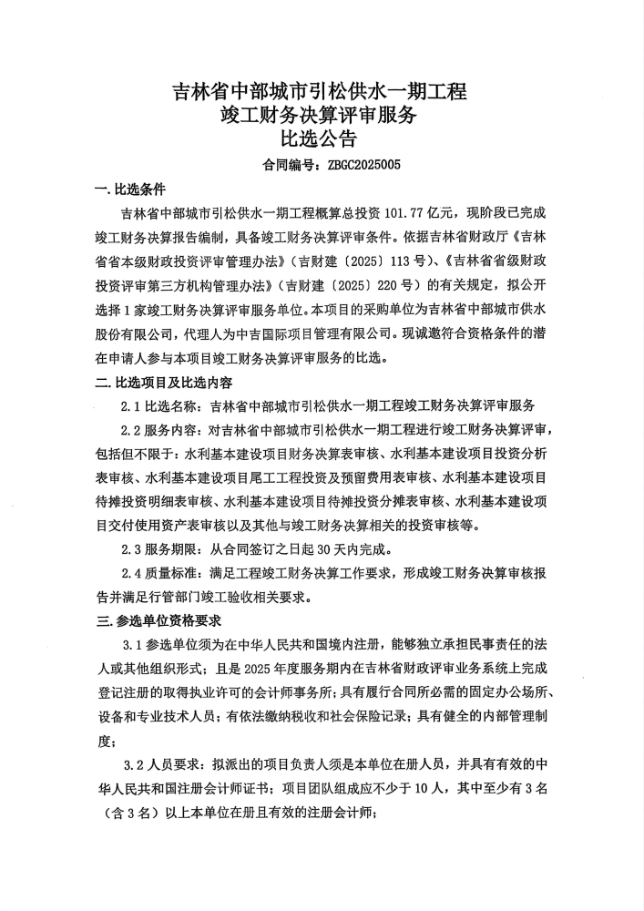 吉林省中部城市引松供水一期工程竣工财务决算评审服务比选公告
