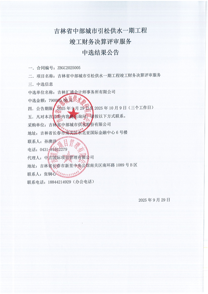吉林省中部城市引松供水一期工程竣工财务决算评审服务中选结果公告