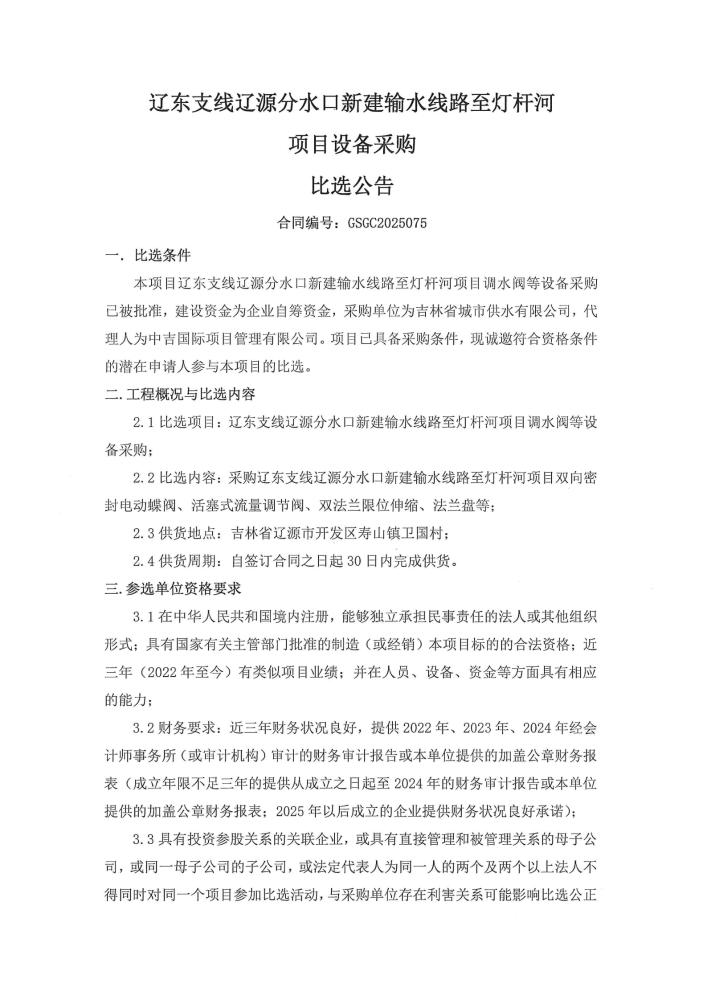 辽东支线辽源分水口新建输水线路至灯杆河项目设备采购比选公告