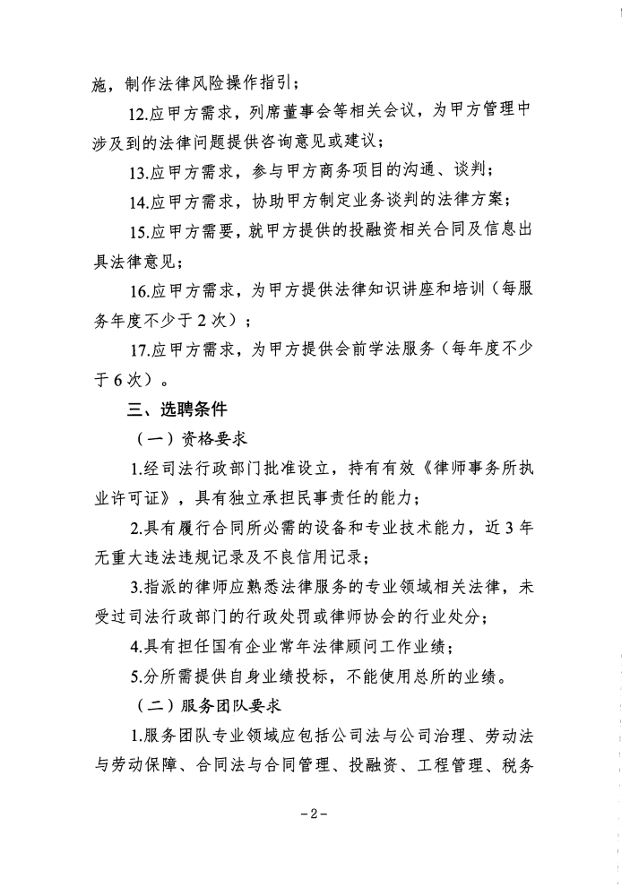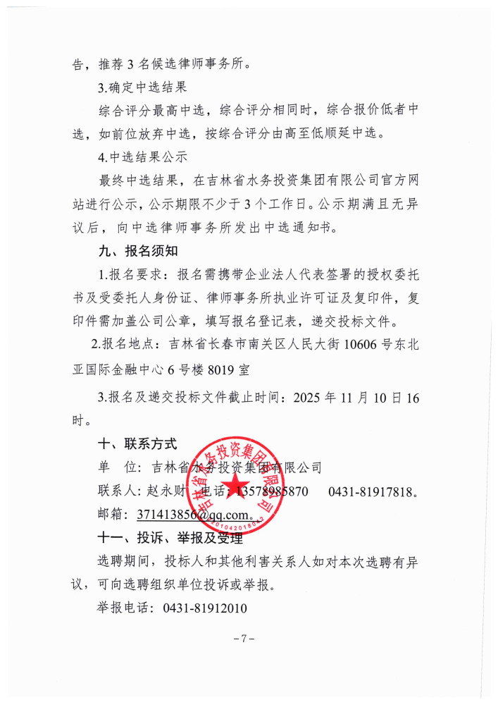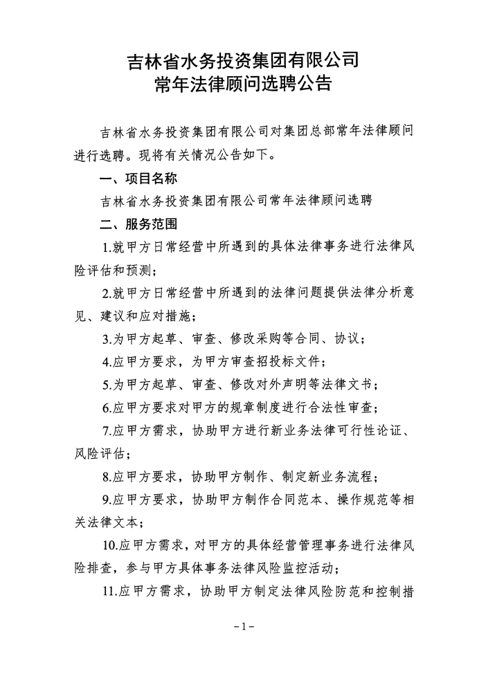 吉林省水务投资集团有限公司常年法律顾问选聘公告