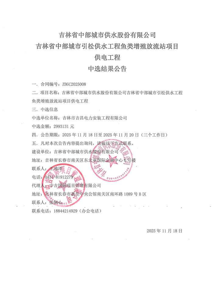 吉林省中部城市供水股份有限公司吉林省中部城市引松供水工程鱼类增殖放流站项目供电工程中选结果公告