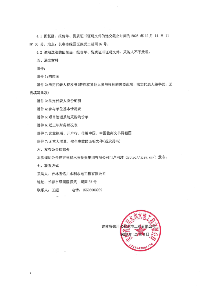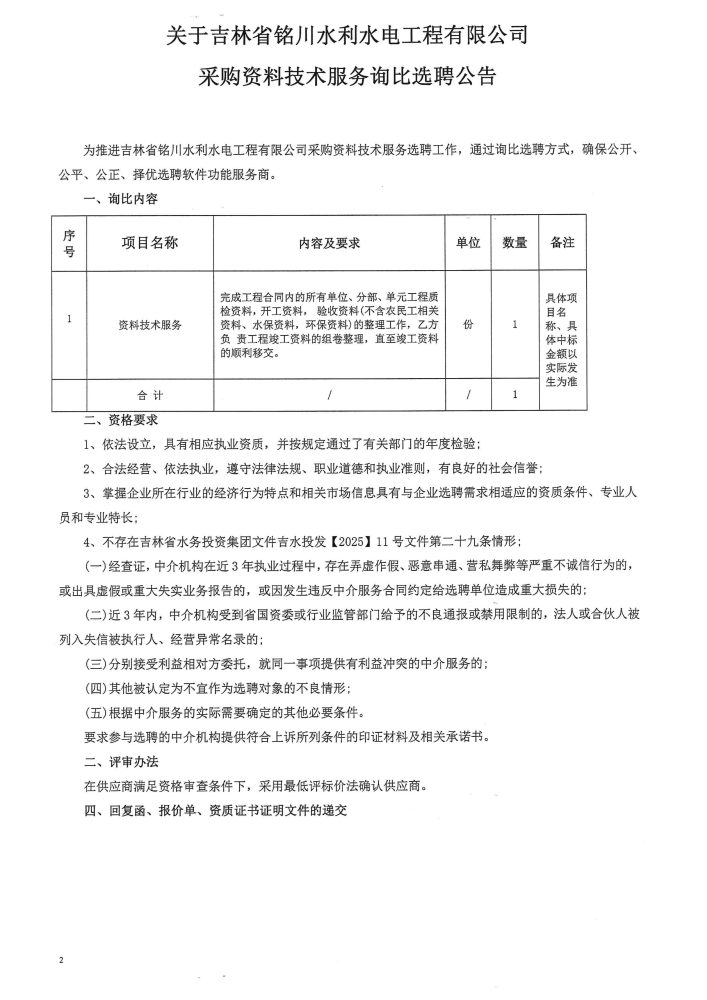 关于吉林省铭川水利水电工程有限公司采购资料技术服务询比选聘公告