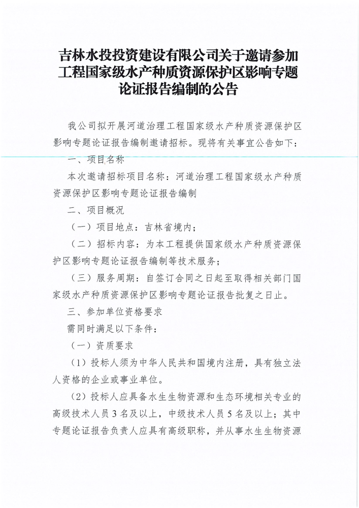 吉林水投投资建设有限公司关于邀请参加工程国家级水产种质资源保护区影响专题论证报告编制的公告