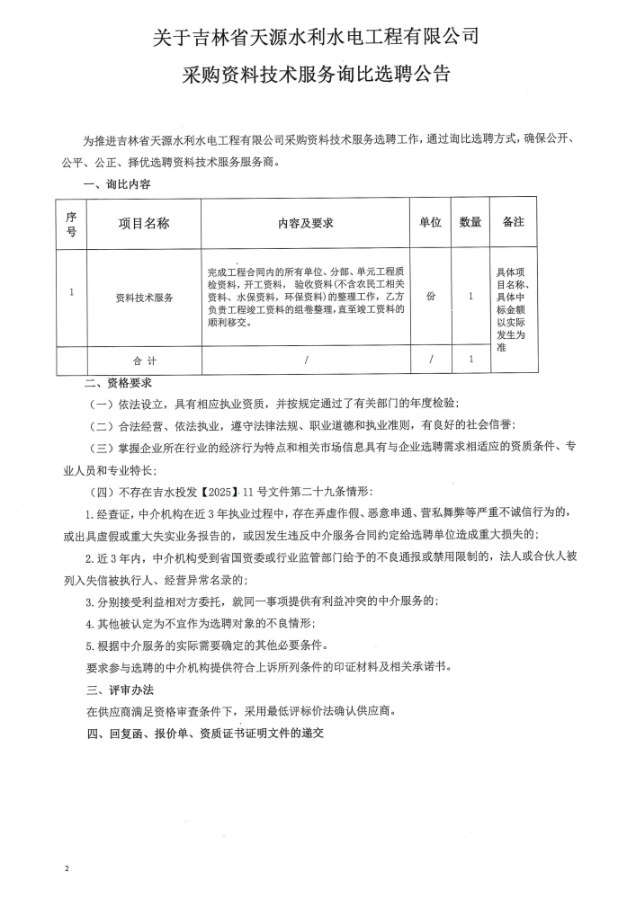 关于吉林省天源水利水电工程有限公司采购资料技术服务询比选聘公告