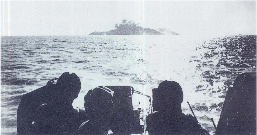 1955年1月18日至19日,中国人民解放军海陆空三军协同作战,一举解放一江山岛。图为在海军、空军的掩护下,登陆舰队迅速靠近登陆点。