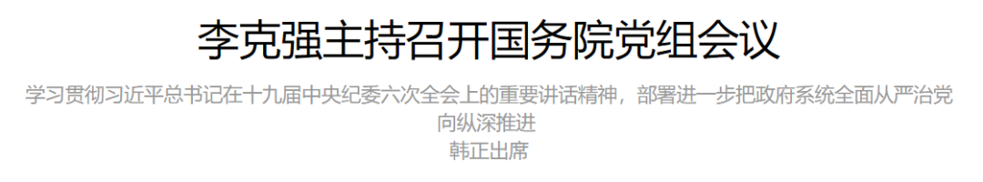 新华社北京1月19日电 1月19日,中共中央政治局常委、国务院总理、党组书记李克强主持召开国务院党组会议,学习贯彻习近平总书记在十九届中央纪委六次全会上的重要讲话精神,部署进一步把政府系统全面从严治党向纵深推进。