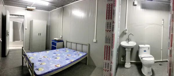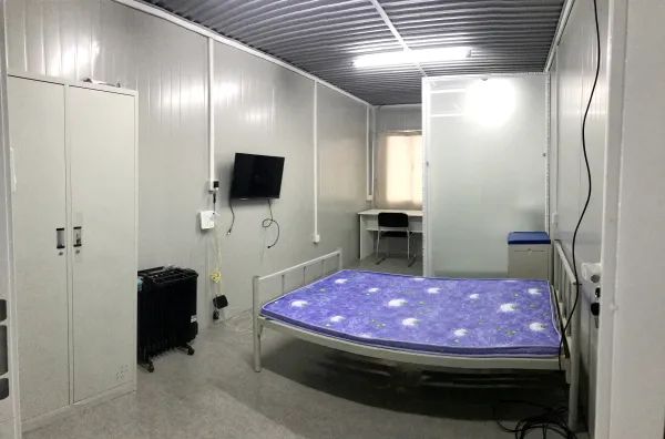 每间隔离房间面积18平方米,设独立卫生间,隔离方舱内提供床单、被罩等生活用品,配有洗手盆、马桶、电暖气、电视、Wi-Fi等,可保障隔离期间生活所需。隔离用房内设置紧急呼叫按钮,灯具全部采用LED节能产品。