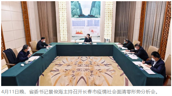 4月11日晚上,省委书记景俊海连夜主持召开长春市疫情社会面清零形势分析会。他强调,长春各级党员干部要切实把思想和行动统一到习近平总书记关于疫情防控的重要讲话重要指示精神上来,按照孙春兰副总理部署要求,坚持“动态清零”总方针不犹豫不动摇,坚定信心、咬紧牙关,从严从紧、从细从实落实各项防控措施,决战决胜长春社会面清零攻坚战。