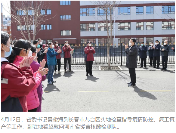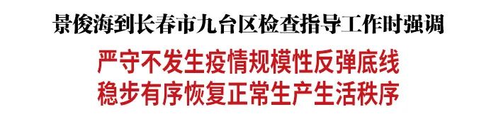4月12日,省委书记景俊海在本轮疫情期间第十次到长春市九台区,实地检查指导疫情防控、复工复产等工作,看望慰问奋战在一线的工作人员。他强调,要深入贯彻习近平总书记关于疫情防控的重要讲话重要指示精神,按照孙春兰副总理部署要求,坚持“动态清零”总方针不犹豫不动摇,采取更加科学精准措施,进一步巩固拓展防控成果,严守不发生疫情规模性反弹底线,稳步有序恢复正常生产生活秩序。
