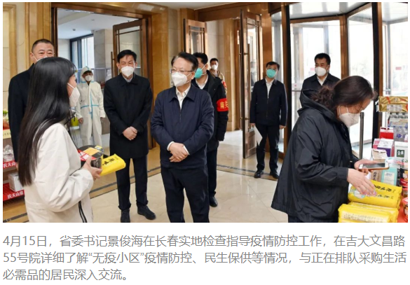 4月15日,省委书记景俊海在长春实地检查指导疫情防控工作,看望慰问一线工作人员。他强调,要深入贯彻习近平总书记关于统筹疫情防控和经济社会发展的重要讲话重要指示精神,按照孙春兰副总理部署要求,坚持科学精准、动态清零,压紧压实主体责任,彻底消除防控盲区,坚决守住不发生疫情规模性反弹底线。