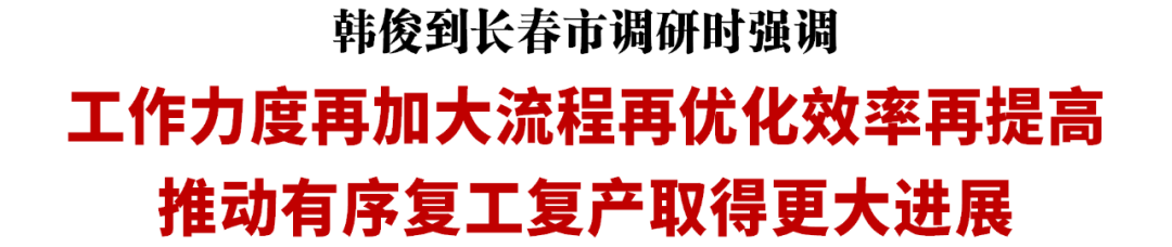 在长春传化公路港城市物流中心,韩俊详细了解企业复工复产、物流运输情况,他强调,要精准组织对接物流企业和复工复产企业,增加货运力量,为复工复产提供物流服务。国网吉林省电力有限公司为疫情防控提供了坚强的电力保障,企业运行保持平稳态势,韩俊对此给予高度评价,他要求国网吉林省电力有限公司加快员工返岗,为推动全省企业复工复产提供电力保障。在东北工业集团,韩俊强调要简化员工返岗流程,确保职工返岗顺畅。韩俊先后来到天合富奥汽车安全系统有限公司、大众一汽平台零部件有限公司,他指出,要以一汽集团为龙头,加快实现一汽五大主机厂全面复工,全力帮助一汽做实做细排产计划,推动产业链上下游企业同步复工,保证产业链、供应链、配套链稳定运行,尽最大努力把疫情造成的损失抢回来。