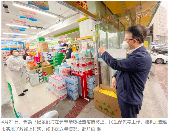 景俊海随机抽查新天地超市西朝阳路二店、吉林大药房同志街连锁店,实地了解线上订购、线下配送等情况,叮嘱工作人员严格遵守防疫规定,每日进行核酸检测,及时把药品物资送到小区,切实满足群众基本生活和正常用药需求。