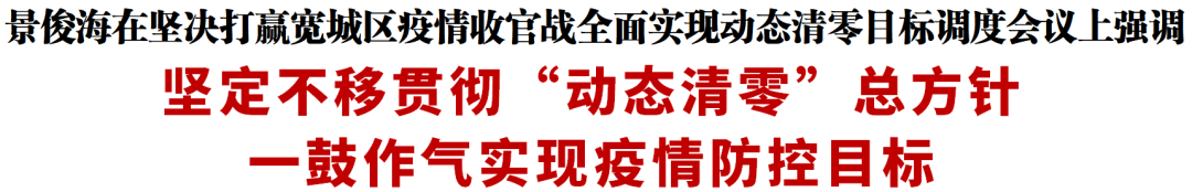 4月23日,省委书记景俊海到长春市宽城区疫情防控指挥部,主持召开坚决打赢宽城区疫情收官战、全面实现动态清零目标调度会议。他强调,宽城区广大党员干部要进一步把思想和行动统一到习近平总书记关于统筹疫情防控和经济社会发展的重要讲话重要指示精神上来,坚定不移贯彻“动态清零”总方针,坚持快、准、严、细、实,一鼓作气实现疫情防控目标,坚决夺取抗击疫情全面胜利。