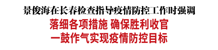 今天,省委书记景俊海在长春市实地检查疫情防控工作,看望慰问一线工作人员。他强调,要深入贯彻习近平总书记关于统筹疫情防控和经济社会发展的重要讲话重要指示精神,按照孙春兰副总理部署要求,坚持科学精准、动态清零,继续落细各项措施,确保抗疫胜利收官,一鼓作气实现疫情防控目标。