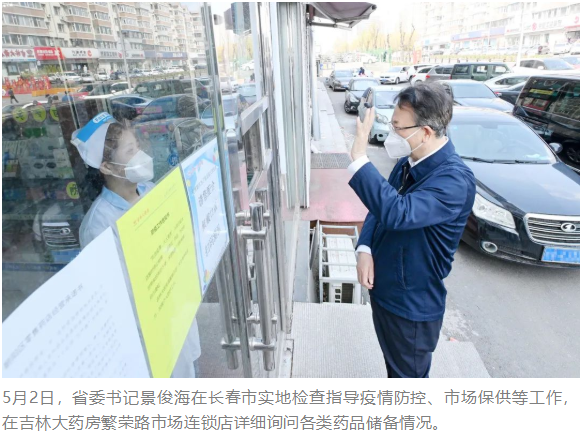 5月2日,省委书记景俊海在长春市随机查访居民小区、超市药店等处,实地检查指导疫情防控、市场保供等工作,看望慰问坚守一线的工作人员。景俊海强调,要深入贯彻习近平总书记关于高效统筹疫情防控和经济社会发展的重要讲话重要指示精神,按照孙春兰副总理部署要求,坚持“外防输入、内防反弹”总策略和“动态清零”总方针不动摇,慎终如始抓好常态化疫情防控,稳步有序恢复群众正常生产生活秩序,坚决做到防住疫情、稳住经济、安全发展。