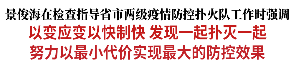景俊海强调,各级疫情防控扑火队要慎终如始、满弓紧弦,继续坚持快准严细实,着力落实好应急处置和常态化防控措施,切实加强口岸管理,严格执行落地检等要求,坚决筑牢外防输入、内防反弹防线,确保科学精准、动态清零各项要求落到实处、见到实效。一是预警行动要快,坚持人、物、环境同防,进一步健全监测预警体系,发现疫情及时按规定采取加密核酸检测频次、限制人员流动等措施,确保处置在早、扑灭在小。二是流调排查要准,组织摸排进村屯、进社区、进楼栋,全面追踪阳性感染者源头链条和涉疫场所,确保万无一失。三是隔离转运要严,对阳性感染者及密接、次密接人员必须及时转送到定点医院和集中隔离点,确保全程绝对安全。四是环境消杀要细,建立常态化消杀队伍,持续做好预防性消杀,特别是要做好快递包裹集中存放点和邮件快递消杀工作。五是应急演练要实,推动有抗疫经验的扑火队员下沉一线,在实战演练中以老带新、传授经验,不断提高各级扑火队应急处置能力水平。