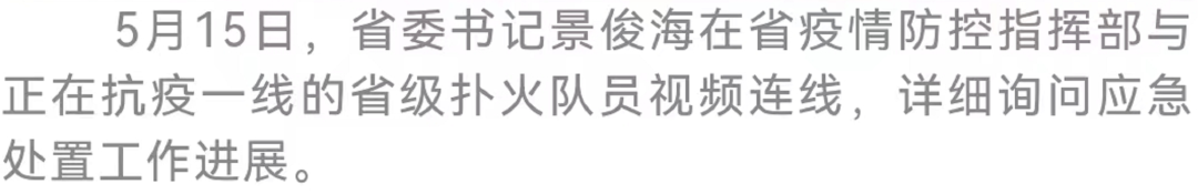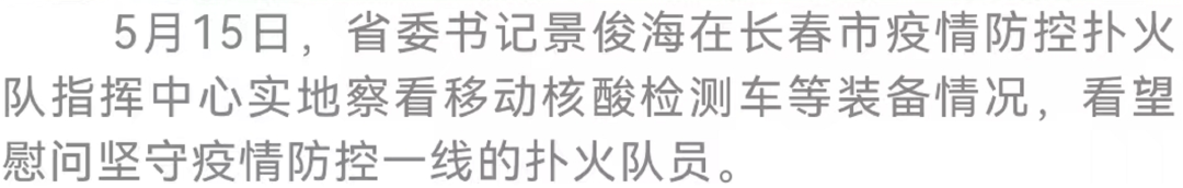 今天(5月15日),省委书记景俊海实地检查省及长春市疫情防控扑火队工作,看望慰问坚守疫情防控一线的扑火队员。他强调,要深入贯彻习近平总书记关于高效统筹疫情防控和经济社会发展的重要讲话重要指示精神,认真落实中共中央政治局常务委员会5月5日会议部署,始终坚持人民至上、生命至上,坚定不移贯彻“外防输入、内防反弹”总策略和“动态清零”总方针,以变应变、以快制快,发现一起、扑灭一起,努力以最小代价实现最大的防控效果,坚决巩固住来之不易的疫情防控成果,以实际行动迎接党的二十大胜利召开。