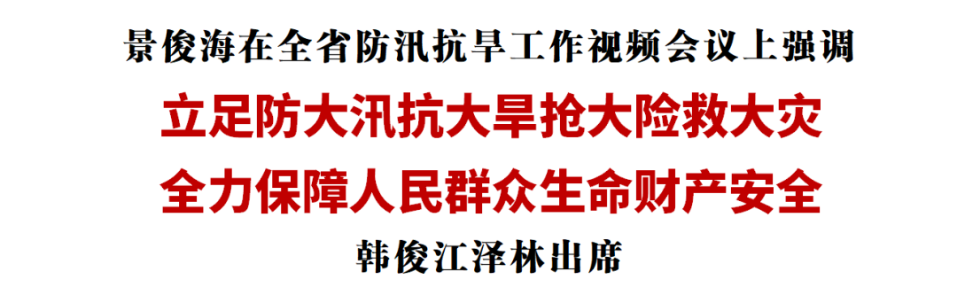 景俊海指出,各级党委、政府要有“时时放心不下”的责任感,深刻认识当前防汛抗旱工作的复杂性、严峻性、艰巨性,严阵以待、严密布防、严防死守,及时补短板、堵漏洞、强弱项、防风险,牢牢守住安全底线。一要坚决压紧压实防汛抗旱责任,各级党委、政府要严格落实党政同责、一岗双责和防汛抗旱行政首长负责制;各级防汛抗旱指挥部要发挥牵头抓总作用,健全完善联合值守、信息共享、协同作战等机制;各位省委常委和副省长要严格落实包保市州制度,各地要建立防汛包保联系机制,围绕预警发布、避险宣传、巡堤查险、转移安置、抢险救援等各环节,紧盯旅游景点、工矿企业、林场、建筑工地和学校、养老院等重点区域和防护对象,逐一明确责任单位、责任人员,加强岗位培训、抽查检查,确保各项工作横向到边、纵向到底、取得实效。二要坚决抓好风险隐患排查整改,“一河一策”“一江一策”做好河道清畅加宽及增高强坝等除险工作,科学做好水库蓄水、腾库、加固、防范等各项准备,切实加强涉水景区、化工企业、中小型水库、尾矿库、头顶库等巡防检查;强化城市内涝积水点排查整治,坚持工程措施和临时措施相结合、技防和人防相结合,及时疏浚河道、检修管网、设立蓄水池,在地下商场、在建地铁等重点部位设立警示标识,预置排涝设备,保障出行安全。三要坚决抢占救援抢险先机,加密会商研判频次,及时发布预警信息,全程跟踪调度,建立直达基层责任人的临灾暴雨预警“叫应”机制,确保应急响应行动迅速、处置高效。四要坚决做好抢险救援准备,一旦出现险情要第一时间组织避险转移,特别是对留守老人、儿童、残疾人等特殊群体,要做到不留死角、不漏一人;科学设立救灾临时安置点,快速调用救灾物资,确保受灾群众有饭吃、有衣穿、有住处、有干净的水喝;统筹抓好疫情防控和防汛抗旱工作,确保大灾之后无大疫。五要坚决做好防汛抗旱应急保障,完善应急预案,抓好物资储备,强化救援力量,加强值班值守,切实做到未雨绸缪、居安思危。要提前做好人工降雨等抗旱准备,最大限度降低对农业生产影响,确保今年粮食丰产丰收。