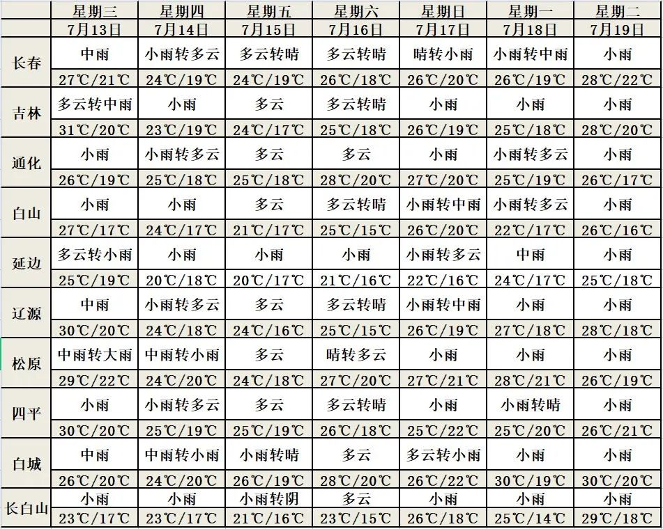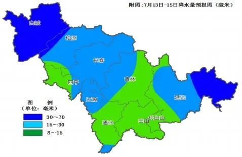 受东北冷涡影响,预计 13-15 日我省雷雨天气明显,中西部及延边地区东部有中到大雨,部分地方有暴雨,并伴有短时强降 水、雷暴大风或冰雹等强对流天气。 较强降雨主要集中在 13 日午后到夜间,白城、松原、长春、辽源、吉林西部有中到大雨,部分地方有暴雨,其他地区有小到中雨。 14-15 日延边地区东部有中到大雨,其他地区有分布不均的阵雨或雷阵雨。过程降雨量:白城、松原西部、延边东部为30~70 毫米,部分地方 80~90 毫米,最大单点降水量可达 110毫米左右;松原东部、长春、吉林西部、四平东部、辽源、通化南部、延边西部为 15~30 毫米,部分地方 50~70 毫米;其他地区为 8~15 毫米。本次过程以对流性降雨为主,将伴有短时强降水、雷暴大风或冰雹等强对流天气,最大 1 小时降雨量可达 30~50 毫米。 未来三天天气预报 今天午后,全省多云有时晴。 今天夜间到明天白天,全省多云,白城、松原、长春、辽源、通化东南部有中雨,部分地方有大雨,并伴有短时强降水、雷暴大风或冰雹等强对流天气,四平、吉林西部和南部、通化中北部、白山、长白山保护区有阵雨或雷阵雨。今天夜间东部地区最低气温为18度左右,其他地区20~23度;明天白天中部地区最高气温为29~31度,其他地区25~27度。 明天夜间到后天白天,全省多云,白城、松原北部有中到大雨,部分地方有暴雨,并伴有短时强降水、雷暴大风或冰雹等强对流天气,其他地区有小到中雨。 14日夜间到15日白天,全省多云,延边东部有中雨,白城、松原北部、长春、吉林、通化、白山、延边西部、长白山保护区有阵雨或雷阵雨。 预计今天午后到明天白天,全省大部分地区有3级左右偏南风或偏东风。 未来七天天气预报 分析与建议 一是中西部及延边东部雨量较大,需防范强降水可能导致的中小河流洪涝、低洼地段农田渍涝及城市内涝,山区还要防范山洪、泥石流等次生灾害。 二是本次过程以对流性降雨为主,各地需注意防御局地突发短时强降水、雷暴大风、冰雹等强对流天气。 三是降雨将导致能见度下降、道路湿滑、交通状况变差,对交通出行和室外活动有较大不利影响。