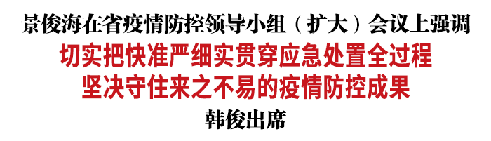 景俊海强调,迅速扑灭局部疫情,必须以时不我待的精神、分秒必争的行动抓实抓细疫情防控各项工作。要及时激活应急响应,迅速开展流调排查,高效推进全员筛查,统筹调度隔离房间,快流调、快筛查、快追阳,确保所有风险人员及时分类转运到定点医院和集中隔离点。要全力救治患者,保障群众正常就医用药需求。要精准实施管控措施,坚决防止疫情外溢。要严格落实重点人员、重点场所防控措施,全面筑牢外防输入、内防反弹坚固防线。要抓紧堵漏洞、补短板、强弱项,全力打造严密的全时空闭环防控体系。