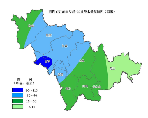 预计过程累计降雨量:白城东部、松原、长春、四平、辽源、吉林西部为 30~70 毫米,其中四平中部可达 90~110 毫米,单点最大可达 120~150 毫米,最大小时雨强可达 40~60毫米;白城西部、吉林东部、通化、白山、延边西部、长白山保护区为 10~30 毫米;延边东部不足 10 毫米。