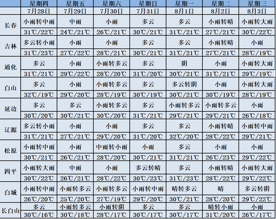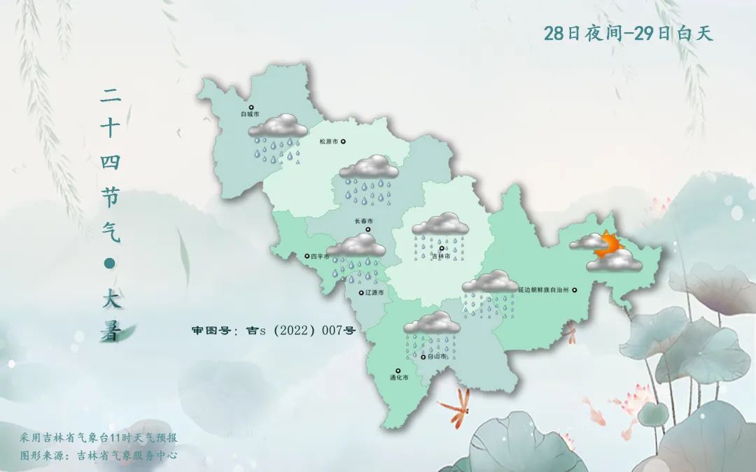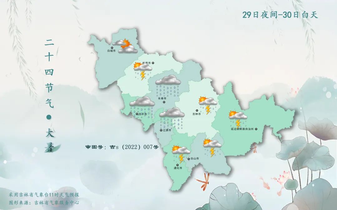 29日夜间到30日白天,全省多云有时阴,长春、四平、辽源、吉林西部有中雨,部分地方有大到暴雨,松原、吉林东部、通化、白山、延边、长白山保护区有阵雨或雷阵雨。